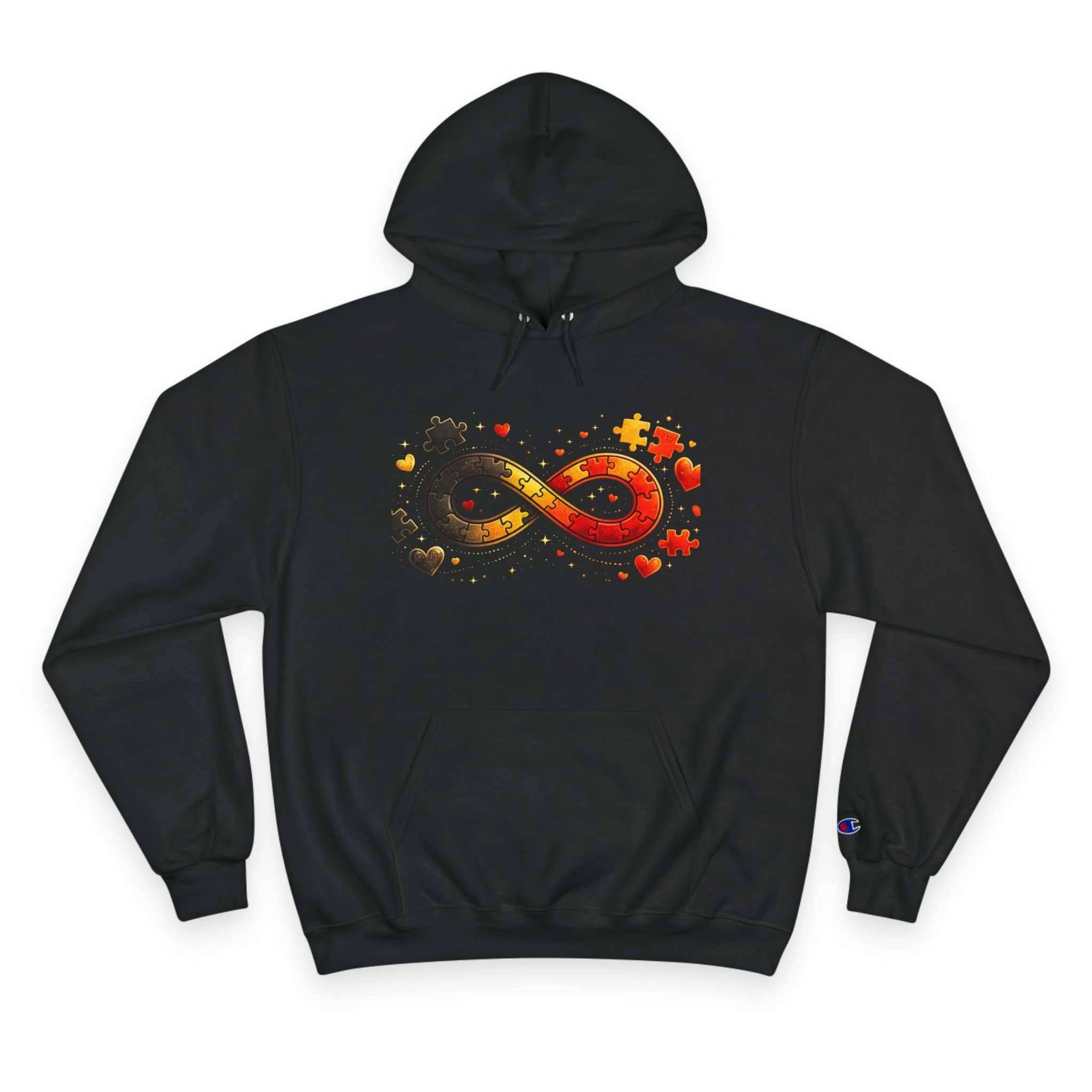 This hoodie carries quiet confidence — soft, warm, and made to be lived in. A rich black Champion hoodie features a vibrant infinity-puzzle design across the chest, the colors flowing like embered paint that catches the eye without shouting. On the back, a simple arched “AUTISM ROCKS” in deep red speaks plainly and proudly. The fit is relaxed and familiar: roomy kangaroo pocket, adjustable hood, and a midweight body that keeps evenings comfortable. It’s the kind of piece you reach for when you want to feel steady — at a meetup, on a crisp morning walk, or curled up with friends. Subtle Champion detailing (the small “C” on the sleeve) and responsibly sourced fibers finish the story: thoughtful, durable, and made to be worn often.