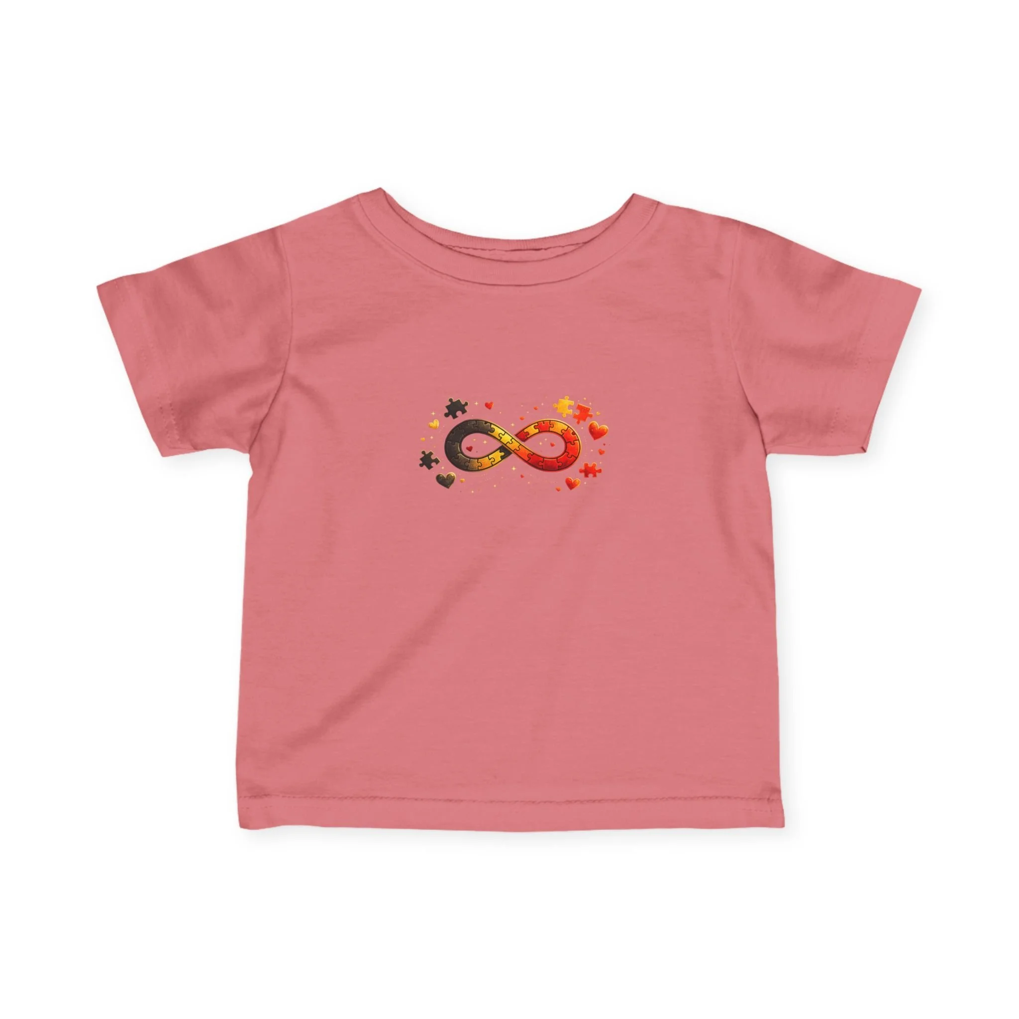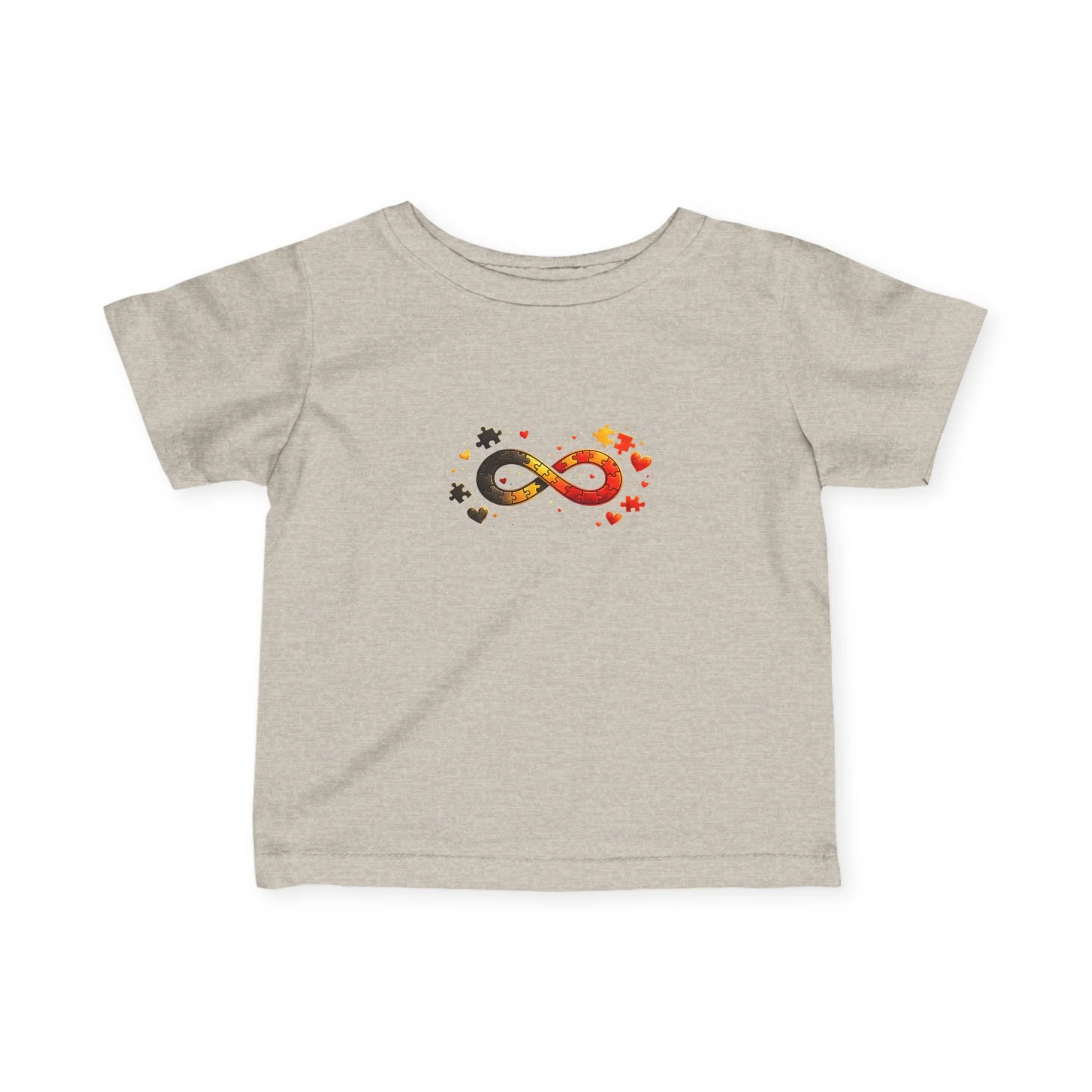 This soft, light-weight infant tee carries a small, meaningful design that speaks gently but clearly. The front shows an infinity symbol woven from warm sunset tones and playful star and leaf accents; the back has a subtle curved message reading "AUTISM ROCKS". Breathable combed ring-spun cotton and thoughtful construction keep the shirt comfortable on sensitive skin while holding shape through washes. It’s the kind of everyday piece parents reach for — easy to layer, easy to move in, and quietly expressive of pride and love.