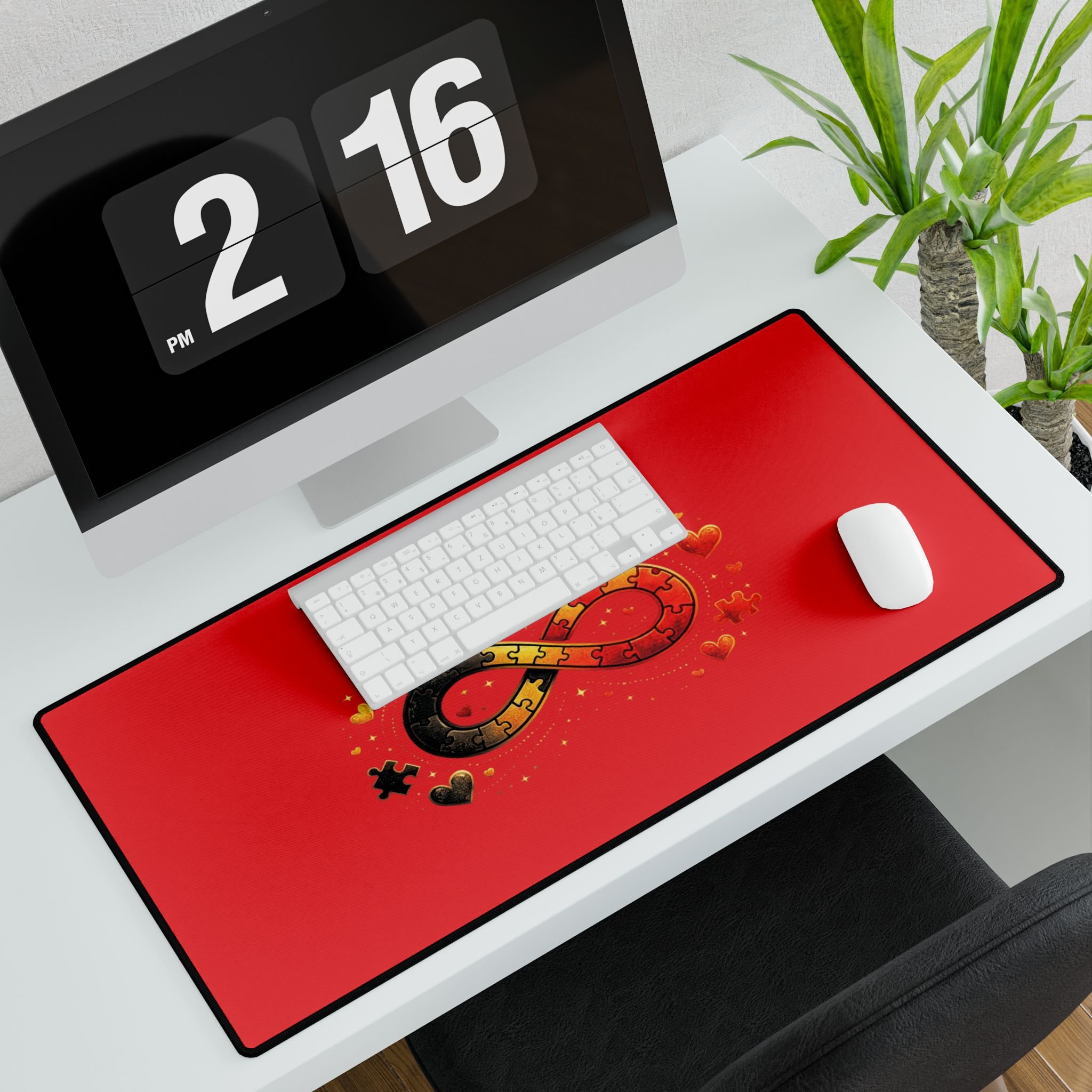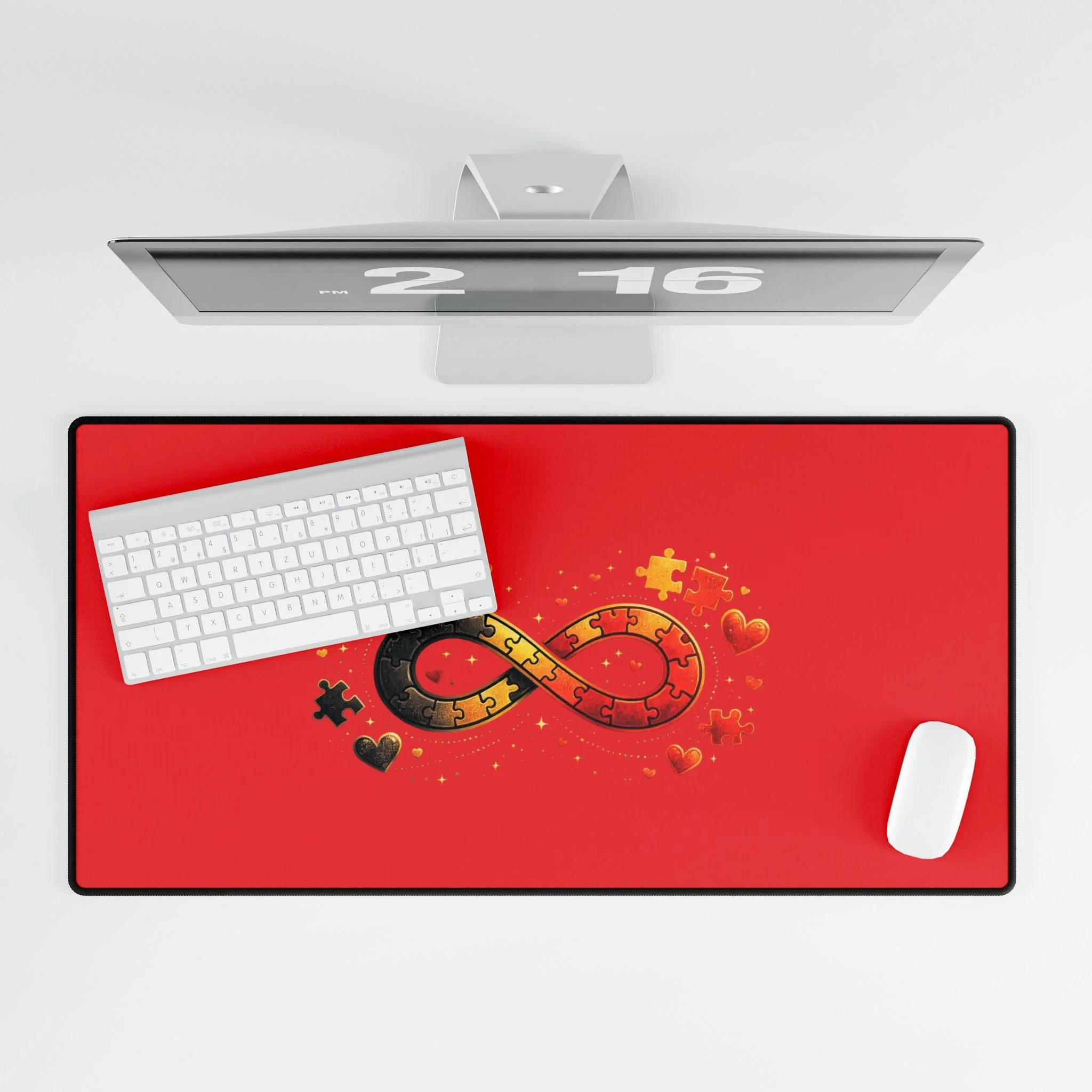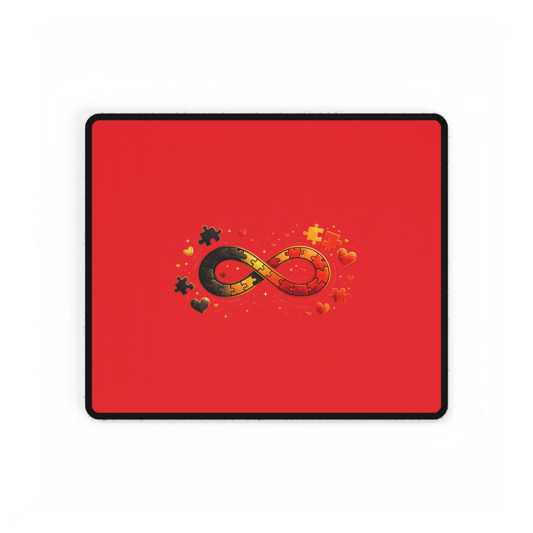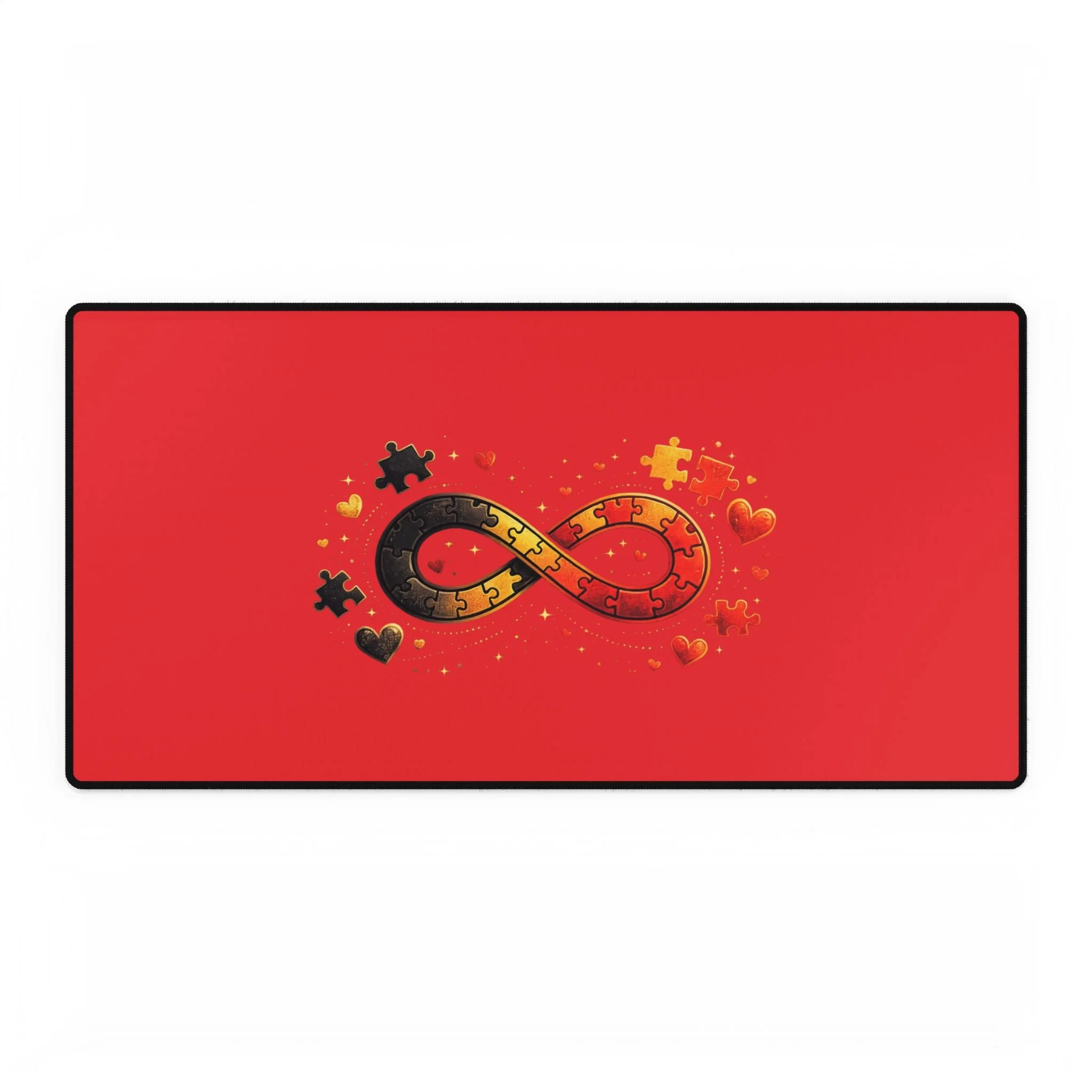 Lay a little warmth and meaning across your workspace. This roomy desk mat spreads a smooth, vibrant red field across your desk with a central infinity ribbon made of interlocking puzzle pieces and tiny hearts — a quiet emblem of connection, love, and persistence. The soft polyester surface feels pleasant under your wrists and lets your mouse glide without fuss. The dense rubber backing stays put while you work, sketch, or game, and the anti-fray edges hold the print looking crisp day after day. It’s the kind of desk piece that turns a plain table into a place that holds memory and intention — for long study nights, focused creative sessions, or calm morning coffee and email checks.