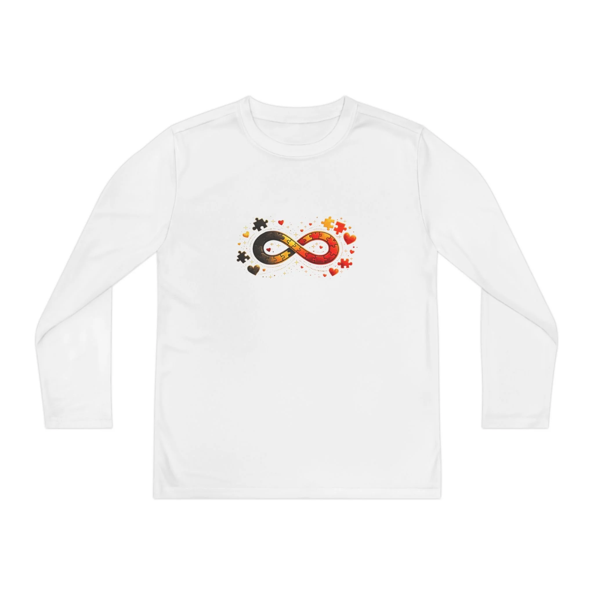Light, breathable, and built for movement — this youth long sleeve brings calm confidence to active days. A subtle infinity symbol on the chest blooms with tiny stars and autumn leaves, carrying a quiet message of endless strength and seasonal warmth. On the back, a modest arched script reads “AUTISM ROCKS,” grounding the design with proud, gentle affirmation. The fit sits close to the body for sporty motion without bulk, and the ultra-light fabric keeps kids cool whether they’re running drills, layering for school, or spending afternoons at the park. It’s a wearable nod to resilience that blends performance fabric with thoughtful, understated style.